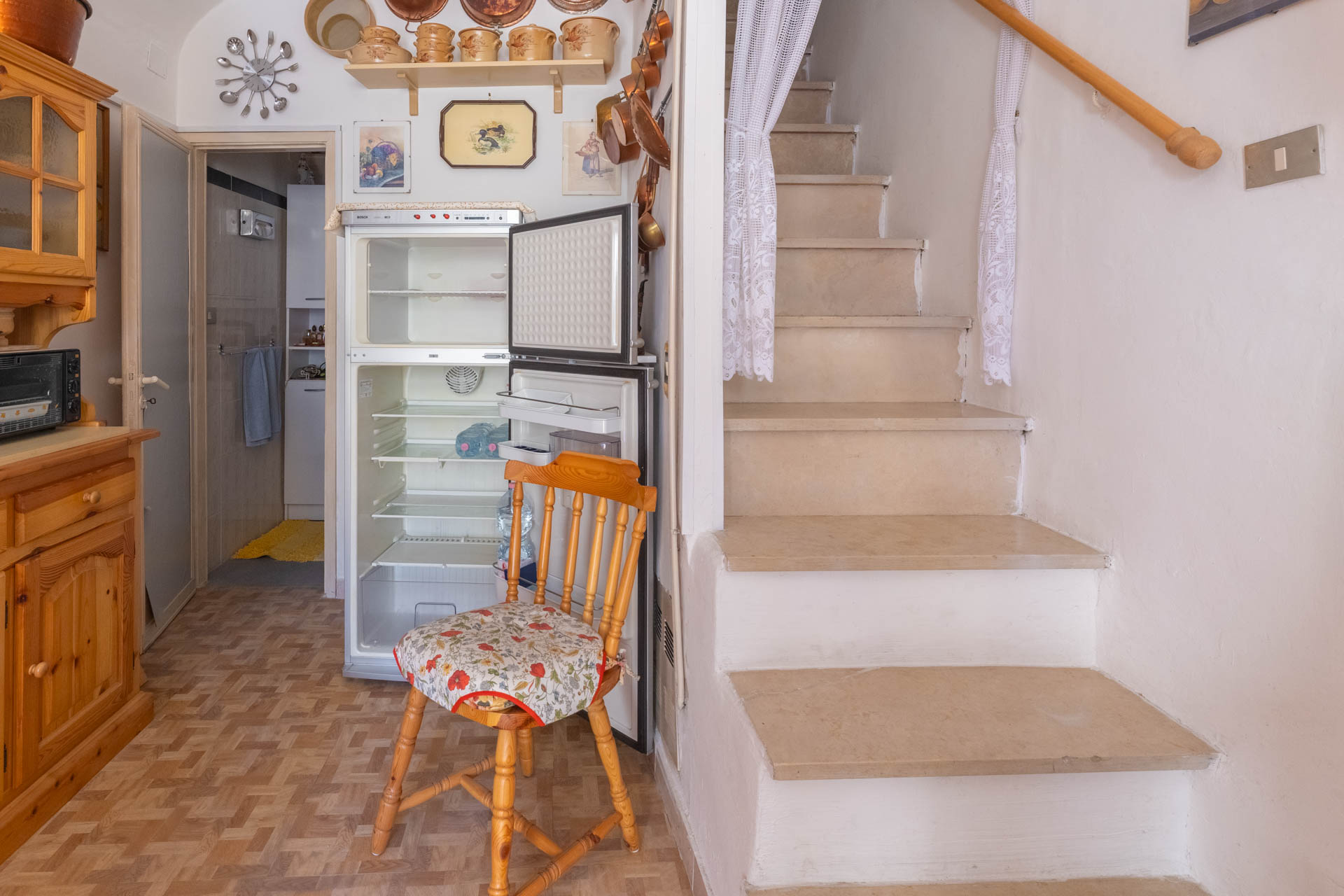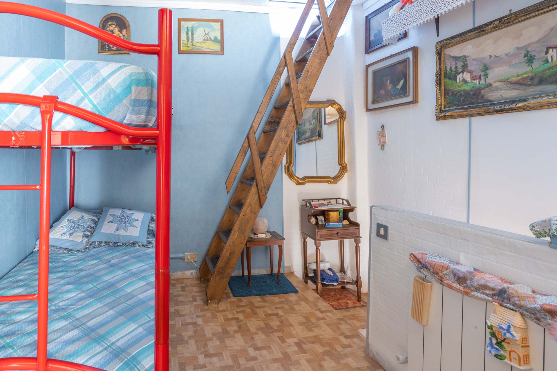 Al piano terra troviamo una comoda cantina adibita anche a lavanderia, ideale come spazio di servizio. L’abitazione vera e propria ha inizio al primo piano, dove si trova una cucina abitabile, perfetta per la vita quotidiana, affiancata da un bagno con doccia. Il secondo piano ospita la camera da letto e un pratico disimpegno dal quale, tramite botola, si accede alla mansarda, sfruttabile come seconda camera o ambiente multifunzione.